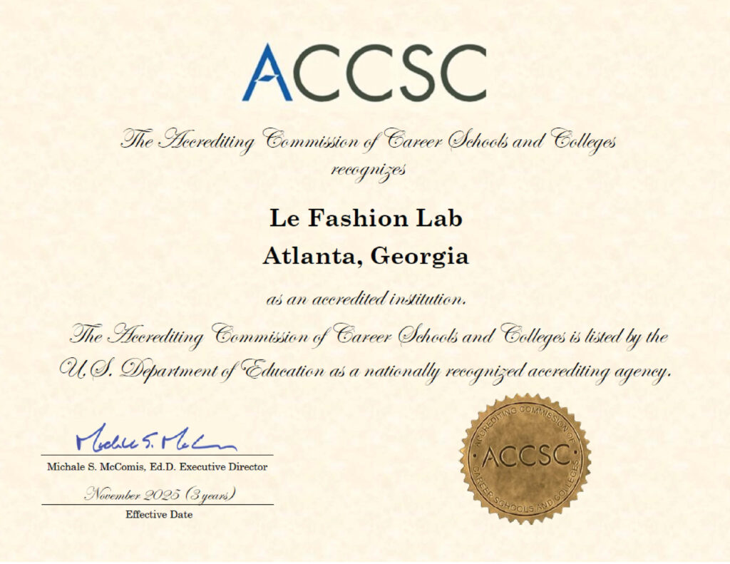 Le Fashion Lab's Fashion Design & Garment Construction Program is nationally accredited by the Accrediting Commission of Career Schools & Colleges (ACCSC). Le Fashion Lab is also certified by the Georgia Non-Public Post-Secondary Education Commission (GNPEC) and our PREP and Fashion Design & Garment Construction Programs are approved by the Veteran's Benefits Administration.